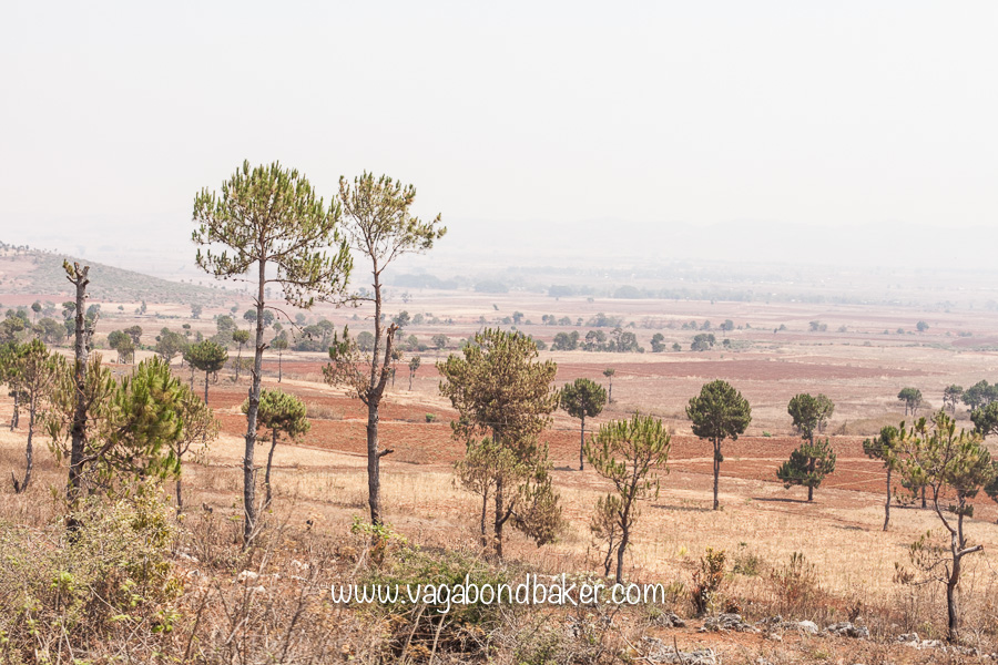 The mountains were forested, dry and brown at this time of year, dropping down into farmed plains with narrow winding rivers.
