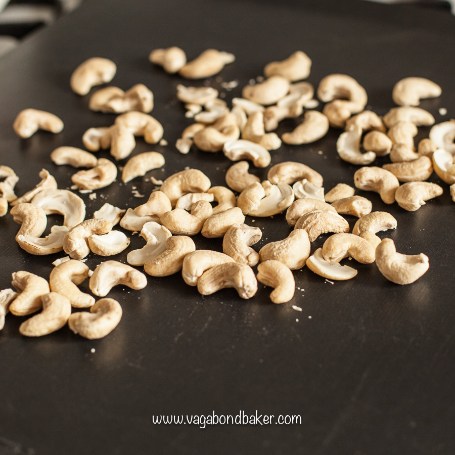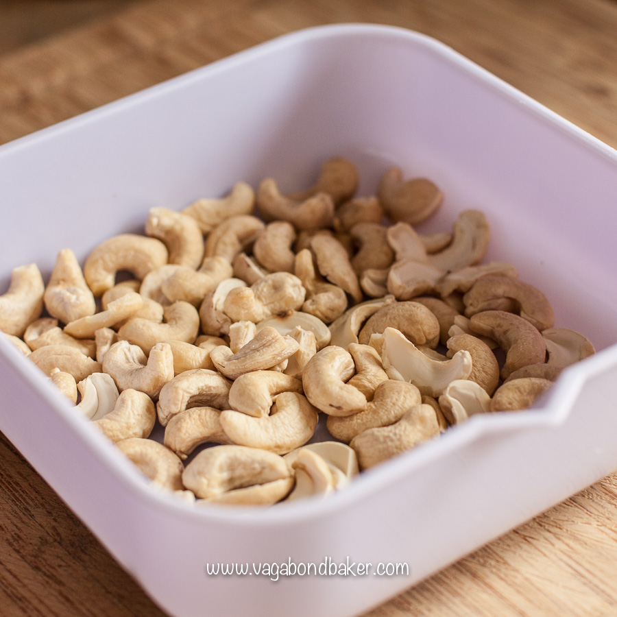 - Begin by dry roasting the first 100 g of cashew nuts: spread them out onto the cookie sheet and roast in the preheated oven for around 10 minutes until lightly golden. Set aside to cool completely.