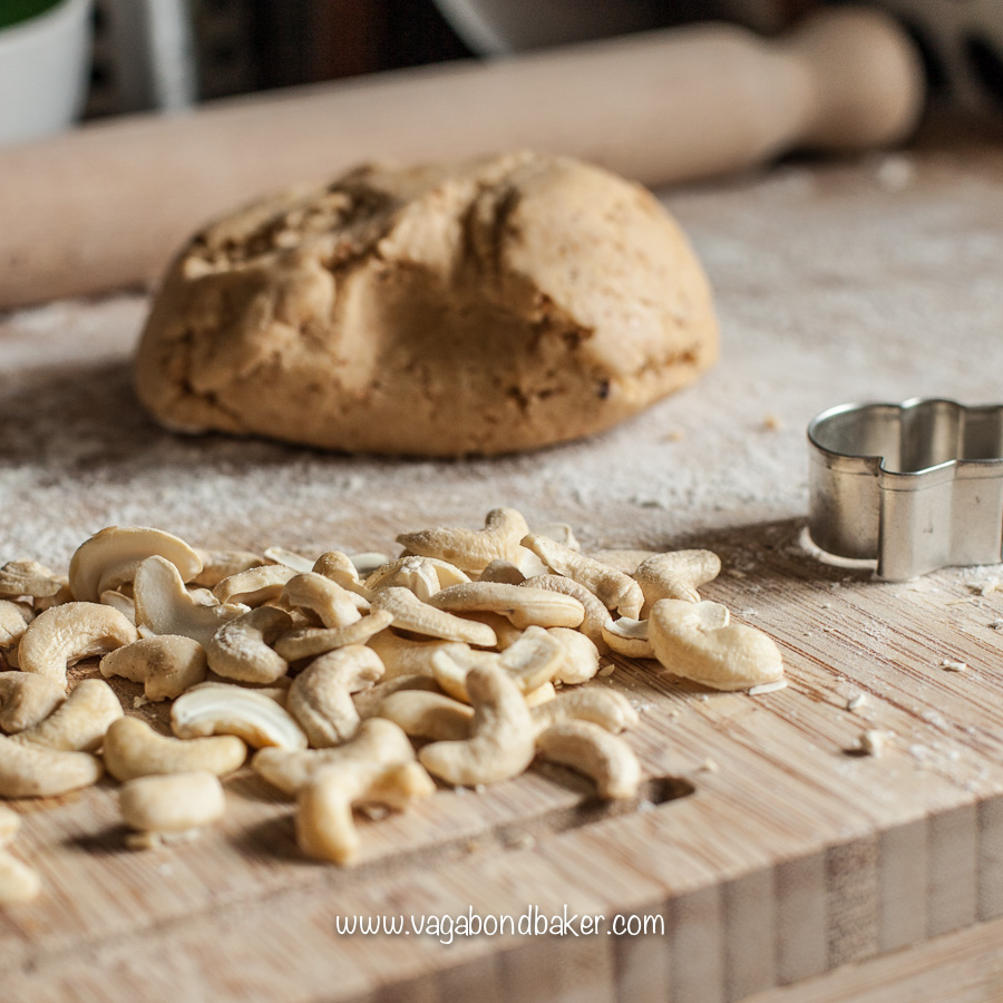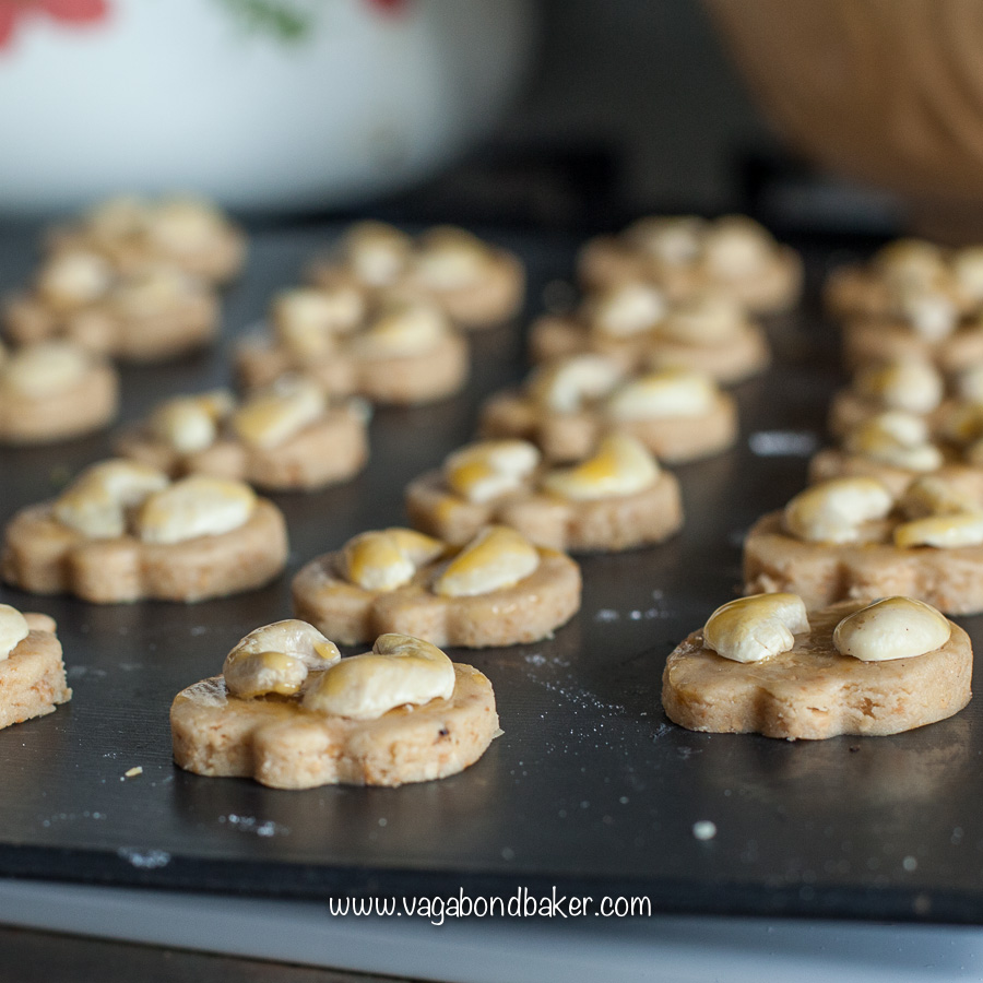 - Beat the second egg yolk and lightly paint the top of each cookie with a pastry brush. Take two cashew halves and pop on the top of each cookie , painting the top of each cashew half with more egg yolk.