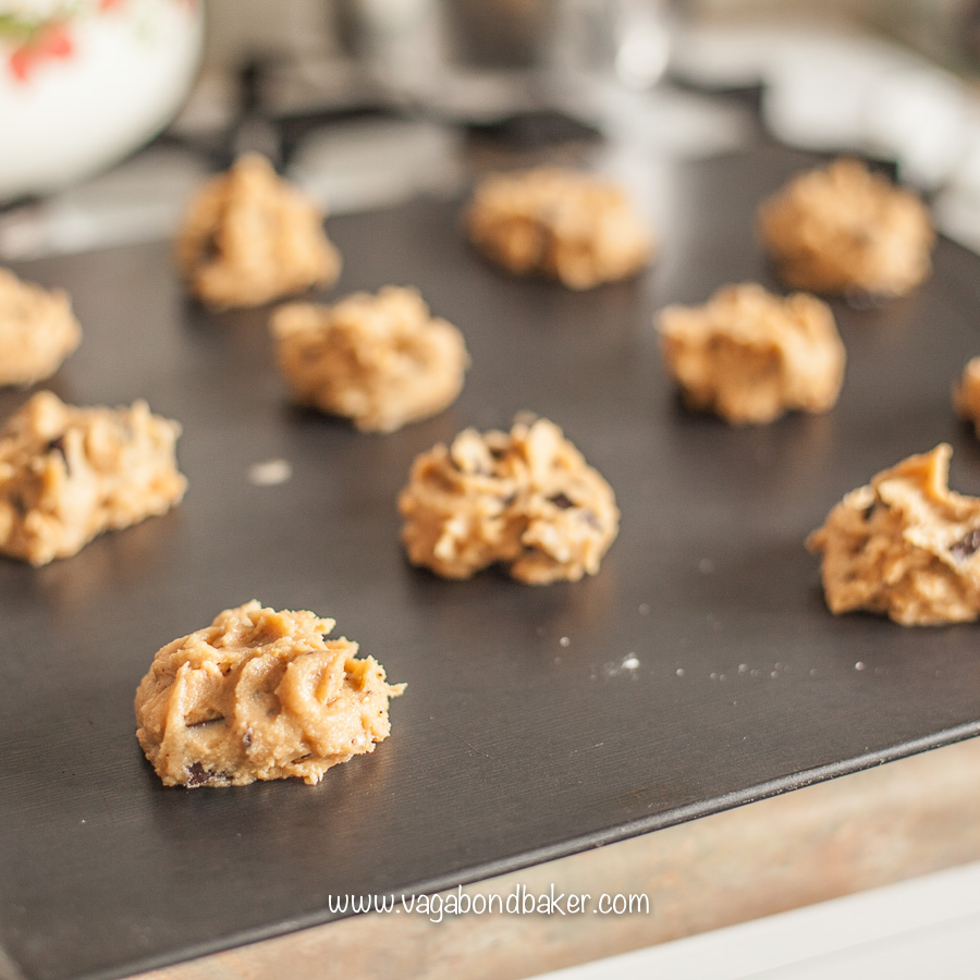 - Use a small ice cream scoop or a tablespoon to dollop onto the baking sheets leaving plenty of room for them to spread. Flatten them a little with your fingertips or a wet spoon. You should get around 16 – 18 cookies.