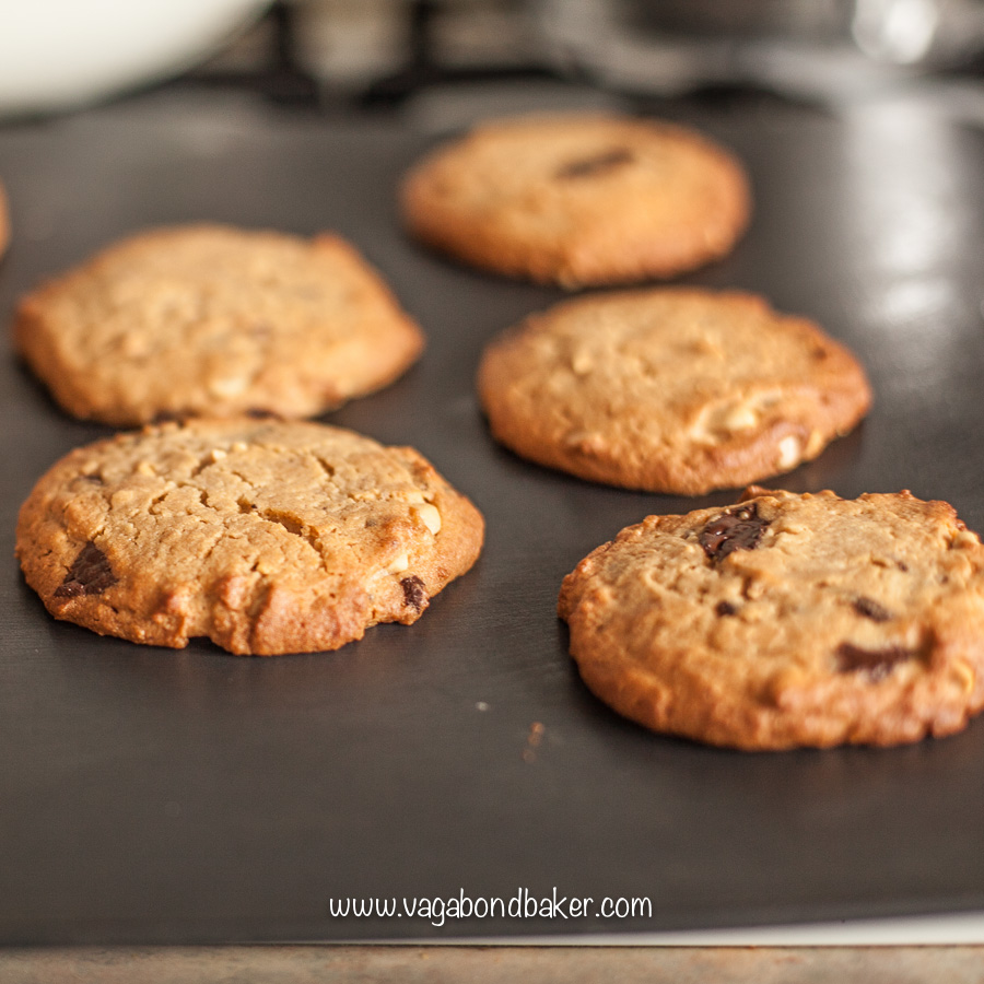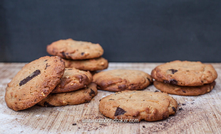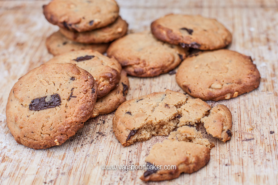 I baked them to take round to a girly night with some friends, everyone was to bring some home-made food along. I needed to make something I could eat as I’m still off dairy, I raided the cupboards and came up with these, they are a tweaked version of my Double Choc Peanut Cookies : one of my earliest recipes here on the blog.