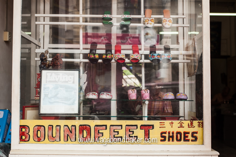 The tiny lotus flower shoes were exquisite yet the thought of them brought tears to my eyes, there were lots of newspaper cuttings on the wall showing bound feet and the lingering, but dying, fashion for it in Chinese culture.