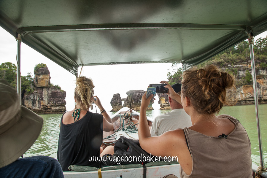 We reached the end of the trail at Telok Pandan Kecil and took a boat to Telok Sibur, a bigger beach a little way around the coast, passing curious sea stacks. The boatman pointed all the rock formations out to us.