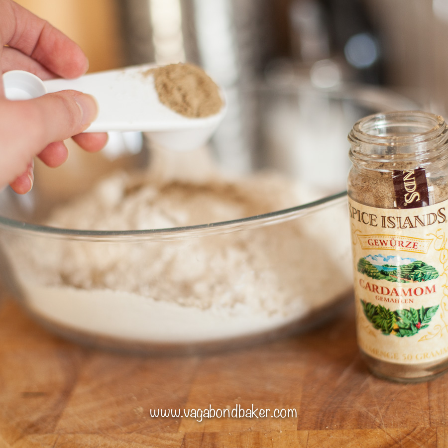 - Place the flour, yeast, ground cardamom and caster sugar into a large bowl and thoroughly mix together: a balloon whisk will do this brilliantly.