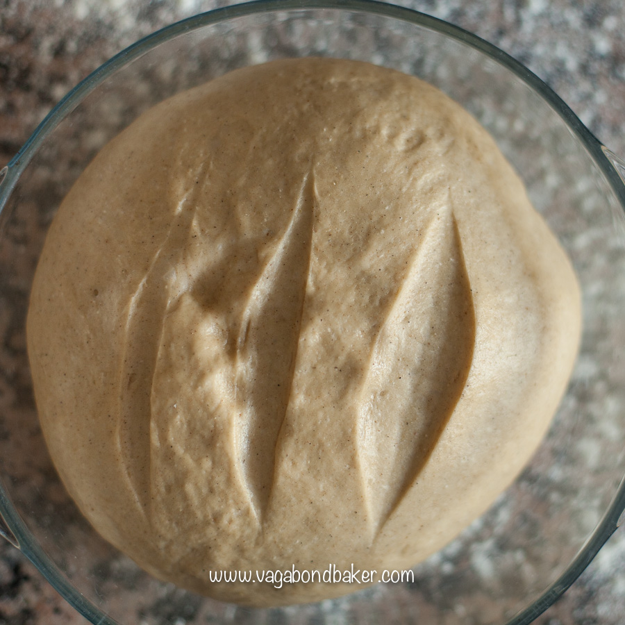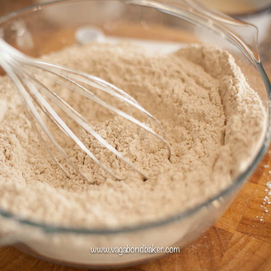 Add most of this liquid to the dry ingredients and begin to combine, switching to your hands. You may need all the liquid, you may need a spot more, depending on the flour and the humidity.