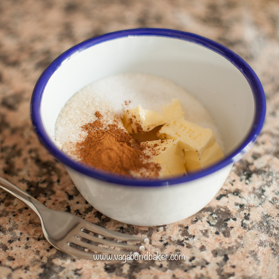 - Meanwhile, make the filling by combining the butter, sugar and cinnamon. Set aside.