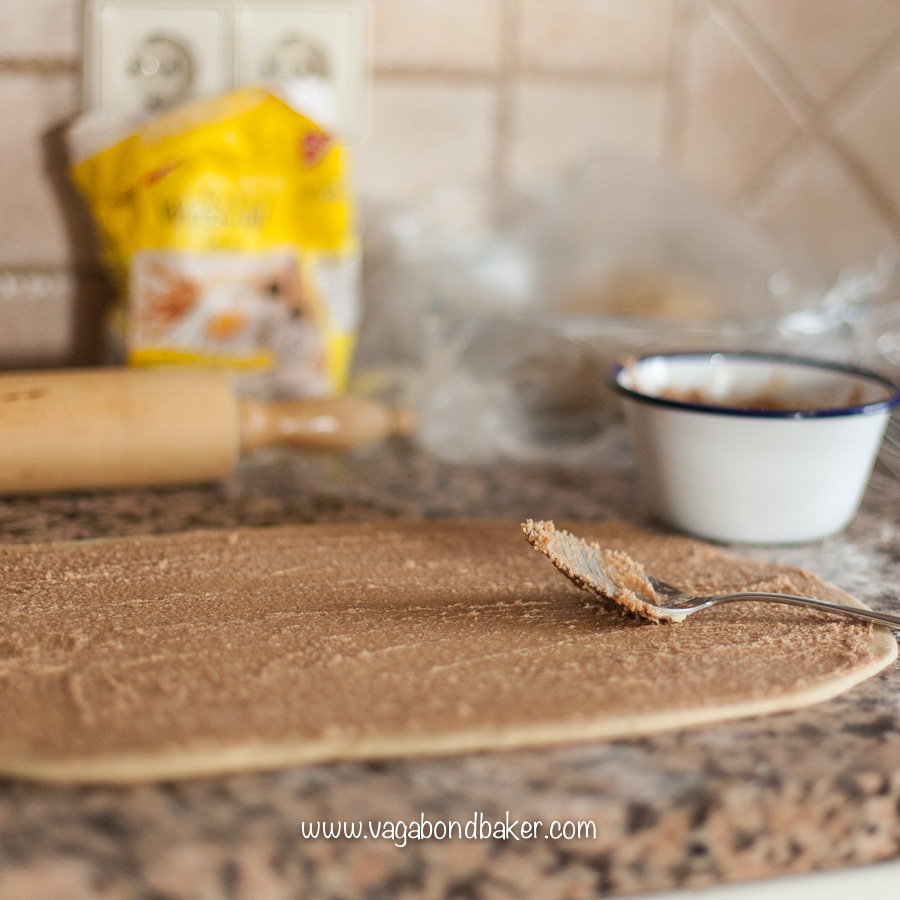 I halve the dough to make it easier to work with. Take one half and roll out quite thinly into a squarish rectangle on a lightly dusted work surface. It wants to be around 5 mm thick; the squarer the rectangle, the more layers in the scroll.
