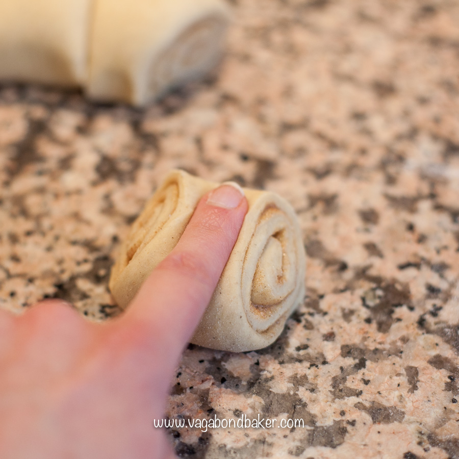 - To transform these wedge-shaped pieces into scrolls, place them wide edge down then firmly press down with your finger in the middle of the buns so the scrolled edges fan out. You need to be really firm or the crease won’t stay.