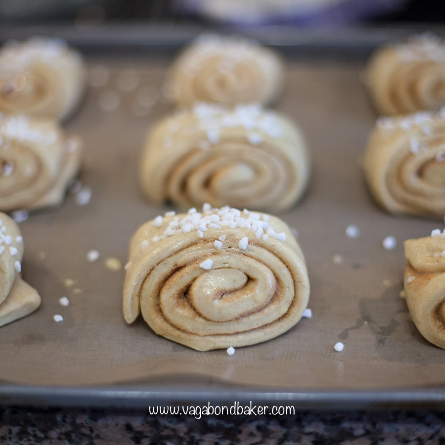 - Brush egg wash over the proven buns and sprinkle with pearl sugar.