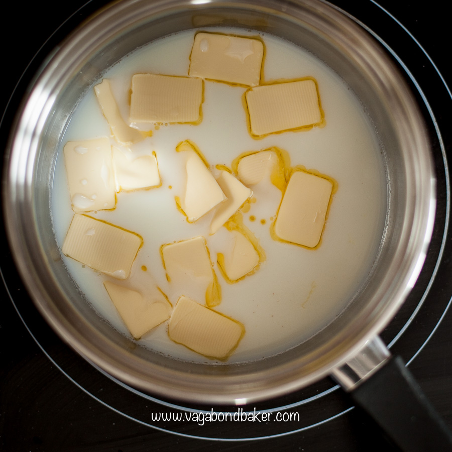 - Heat the milk to almost boiling point then take off the heat then add the salt and the butter (cut into slices if it is straight out the fridge). The butter will melt into the milk. Allow to cool to lukewarm.