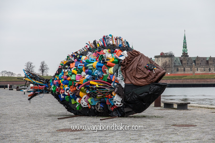 Kronborg Castle, to give it its correct, ‘real’ name is just across the harbour from the railway station, a short, pleasant walk where I discovered this huge fish marooned on the waterside. It was made out of plastic flotsam and jetsam: the rubbish we choke our oceans with.