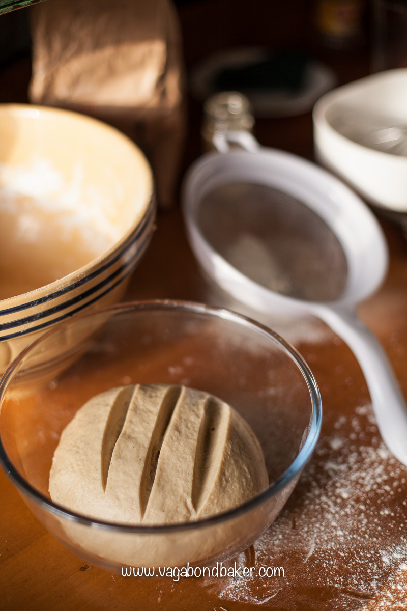 - Place into a clean bowl, slash the top to help it relax and cover with cling film or a tea towel, allow to prove for 30 mins to an hour in a draft free corner of the kitchen, until doubled in size.