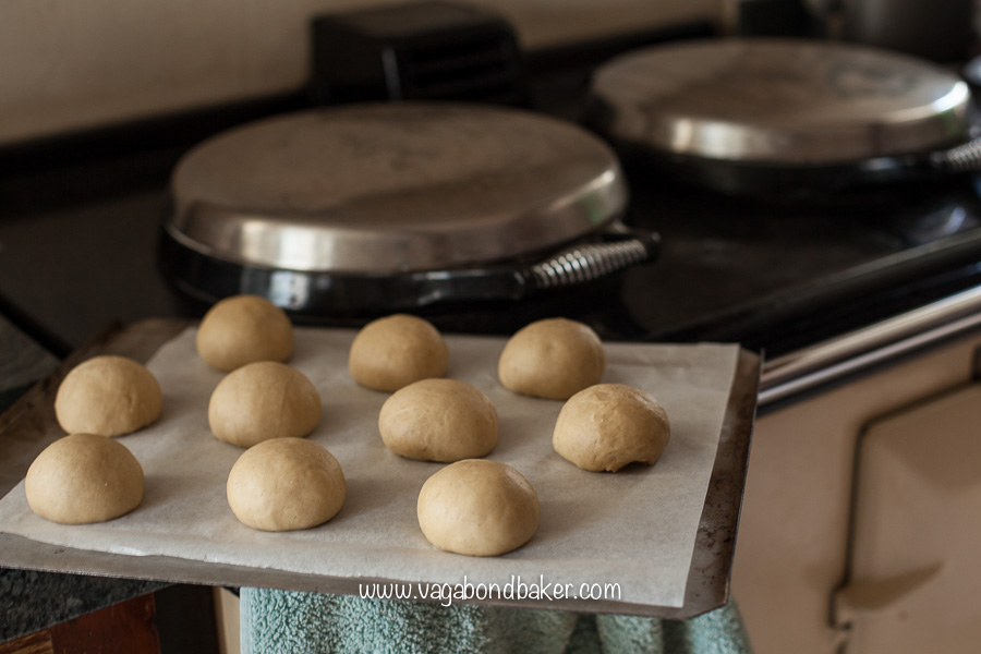 I say perfectly, actually the first batch was a disaster, the pan I used to scald the milk must have retained the onion-y garlic flavours of the Egyptian Fuul I’d made in it the night before because the buns tasted rather odd and savoury! It was one of those days where one mistake lead to another, the dough seemed a little ‘heavy’ and I ended up under-baking them too, getting to grips with the Aga.