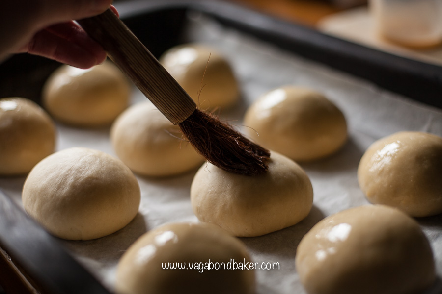 Brush the buns with the remaining tablespoon of beaten egg and bake for 10 to 15 minutes in the preheated oven, until risen and golden.