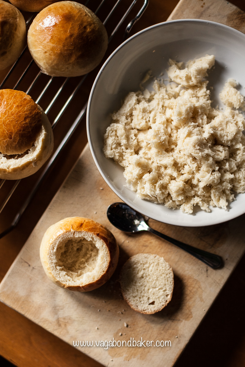 - Once cool, carefully slice of the top of each bun then using a teaspoon (a serrated grapefruit spoon – remember them? – would be even better) scoop out some of the insides of the buns to create a hollow, and place the removed crumbs into a mixing bowl: do not discard.