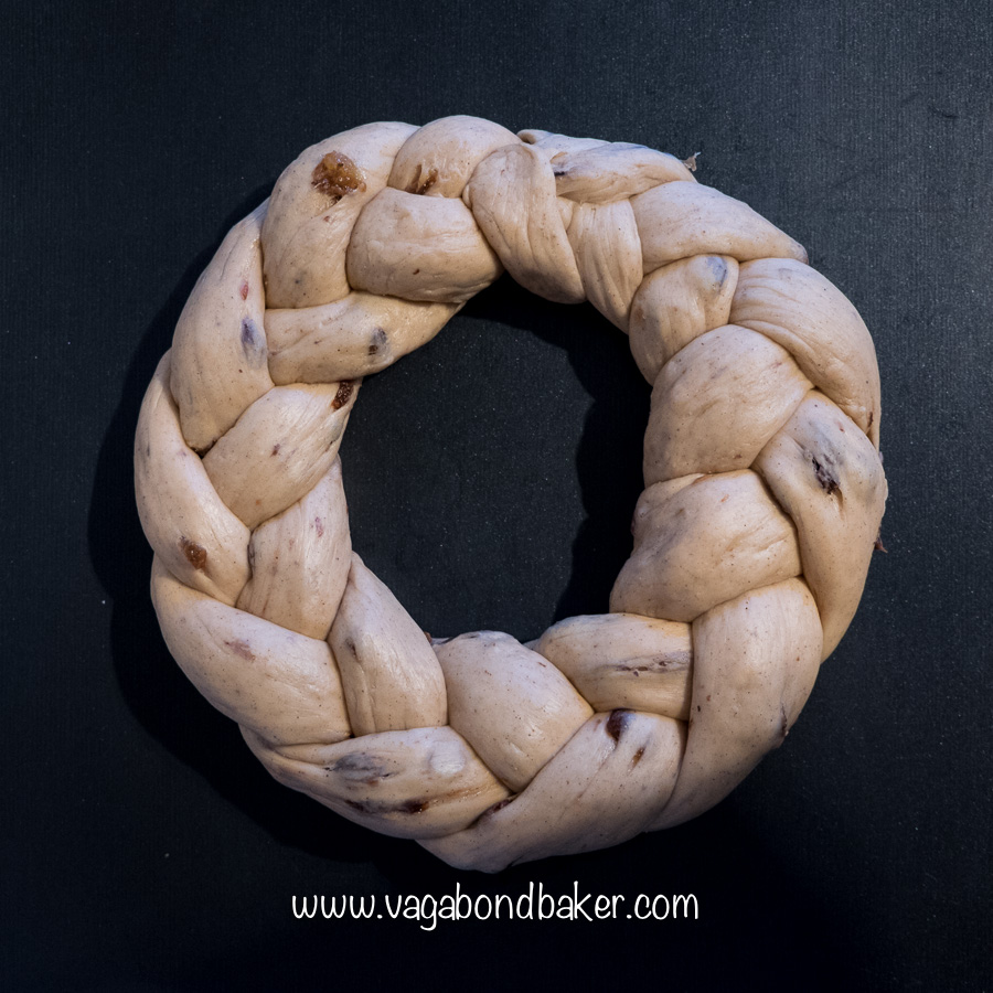 - Plait the dough ropes then form a crown by connecting the two ends by intertwining the loose dough strands.