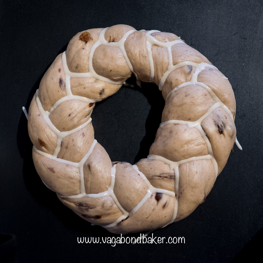Rather than piping crosses I used the paste to highlight the plaiting: the crown still looks Hot Cross Bun-like, albeit a little more regal.