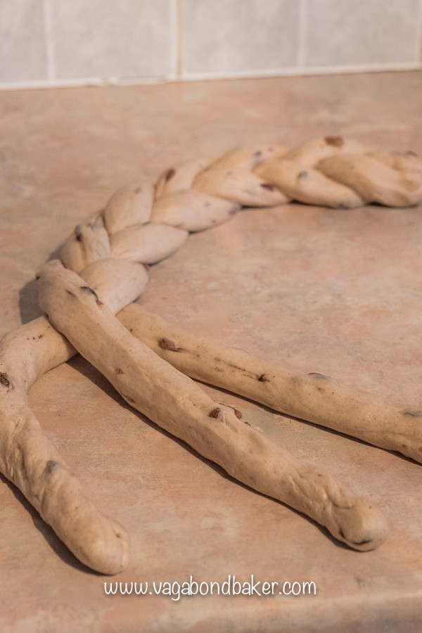 - Plait the dough ropes then form a crown by connecting the two ends by intertwining the loose dough strands.