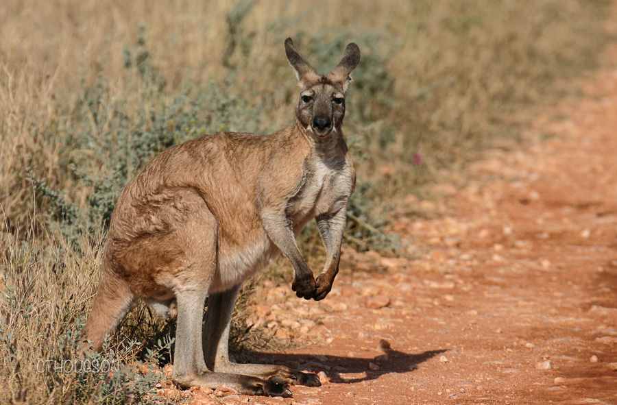 There, staring back at us from the dune was a big kangaroo with a very guilty look on his face!