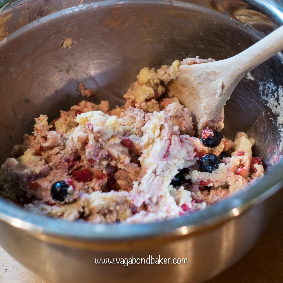 Add the chopped chocolate and the frozen fruit, squishing the raspberries a little with your fingers to break them up a bit.