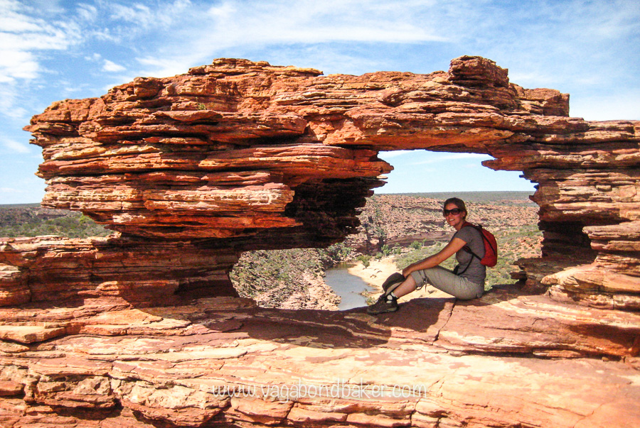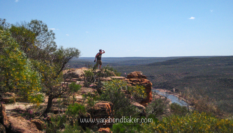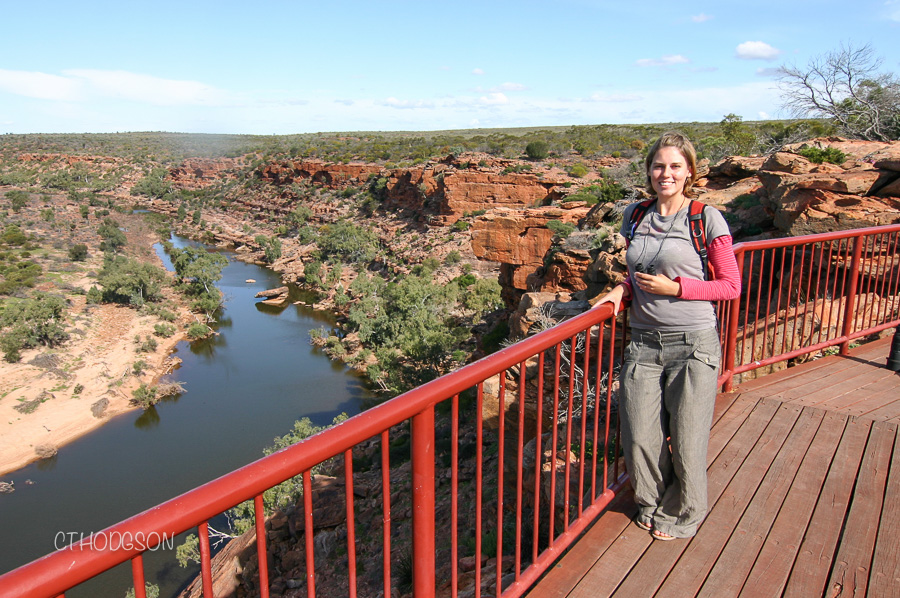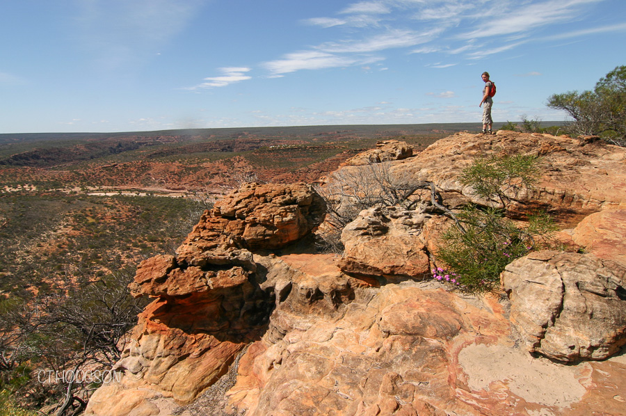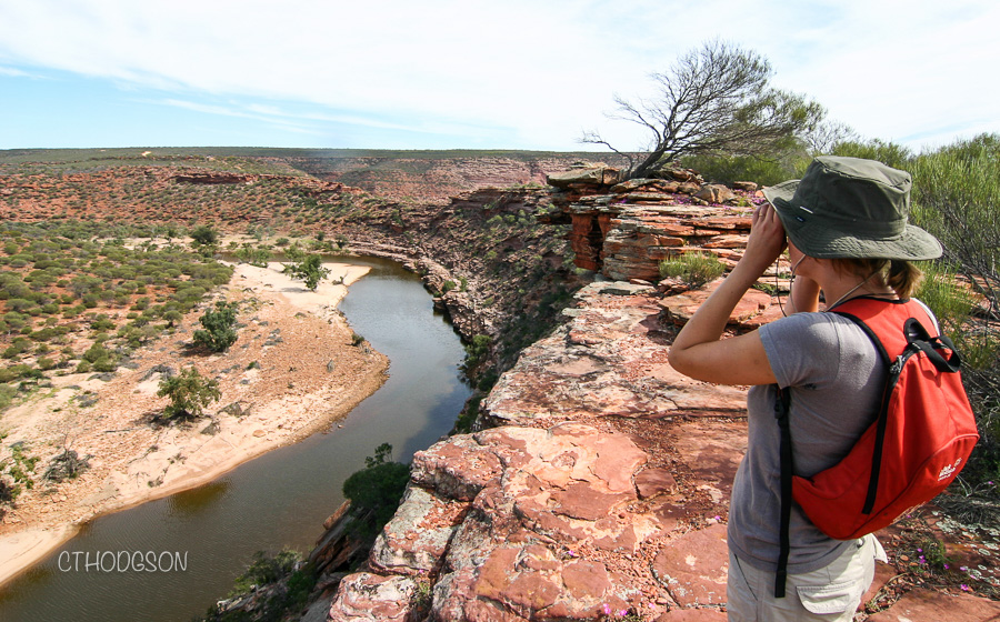 We set out on the 8km walk around the loop, a switchback on the course of the Murchison River. Not far along the trail we came to Nature’s Window, a rock ‘hole’ framing a perfect view of the river flowing east. The trail then went along a narrow rocky ridge before dropping down towards the riverbank.