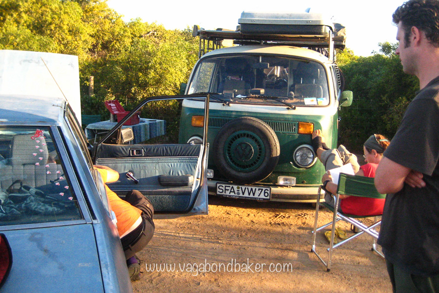 $200 down, and no solution to our light problem, we left Geraldton with shiny new plates and a fresh change of oil. Camping back at Coronation Beach, Lotti had a look at our electrics. His van was full of tools, if you drive an old van around Australia, you probably need some knowhow!