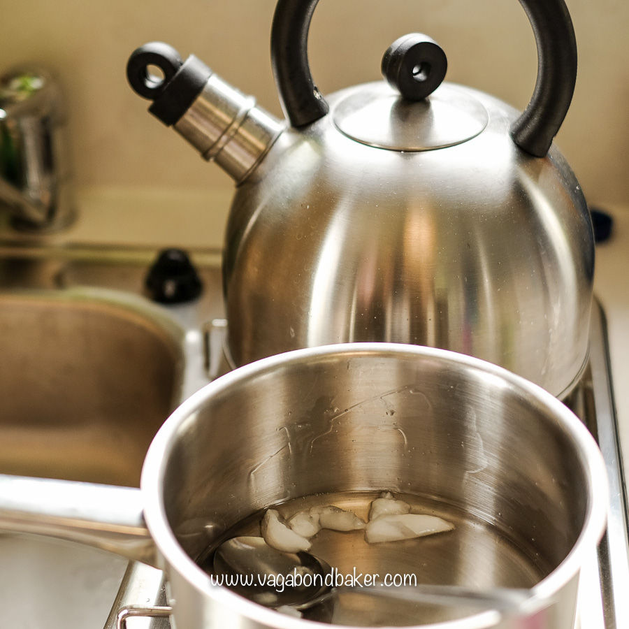 Measure out the coconut oil into a pan, I did this by placing the pan onto my scales and weighing the solid coconut oil into it (or you could melt it and measure it into a measuring jug (100 ml).