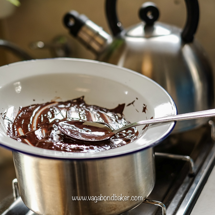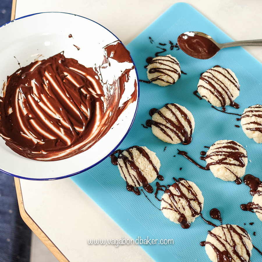 - Meanwhile, melt the chocolate in a dish or bowl over a pan of barely simmering water, remove the macaroons from the freezer and drizzle over the melted chocolate: I used a spoon but you could also make a piping bag with a cone of parchment.