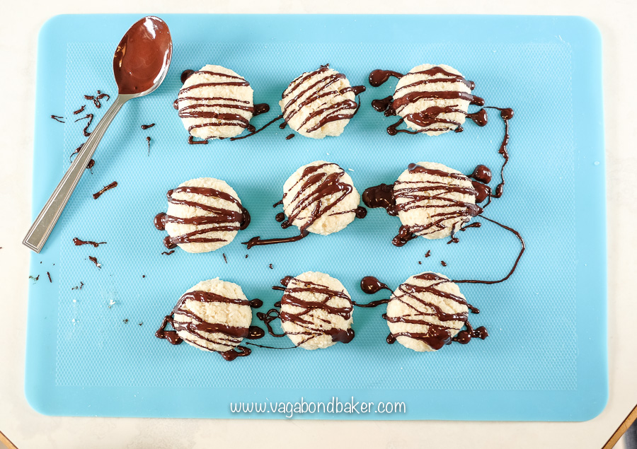 - Meanwhile, melt the chocolate in a dish or bowl over a pan of barely simmering water, remove the macaroons from the freezer and drizzle over the melted chocolate: I used a spoon but you could also make a piping bag with a cone of parchment.
