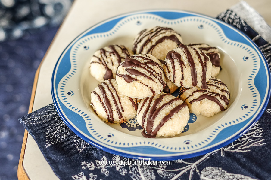A simple recipe of coconut and ground almonds combined with coconut oil and a sweetening syrup to make moist little cookies.