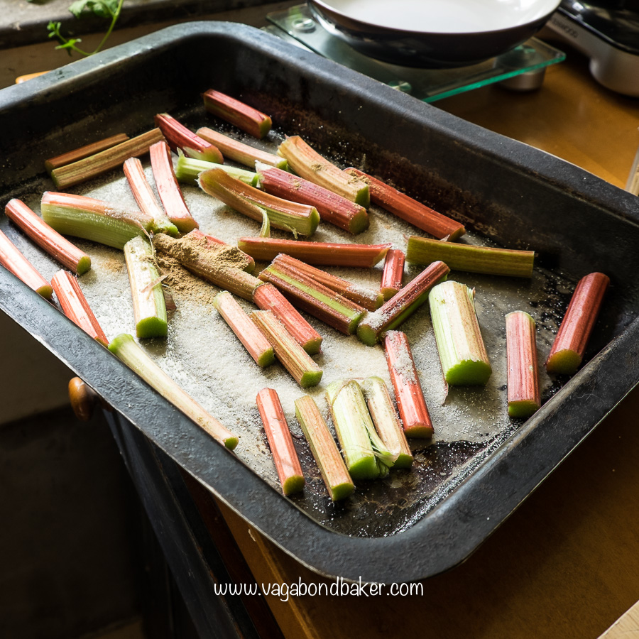 To make the curd I roasted the rhubarb with a little sugar and ginger. I like roasting it as it intensifies the flavour, you could stew it on the hob too though.