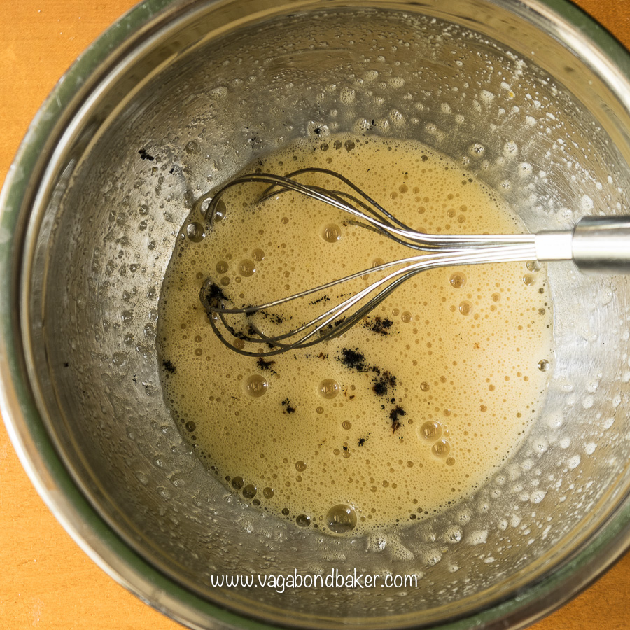 - Break the eggs into a large bowl and add the sugar. Either by hand with a balloon whisk, or using a hand held mixer, beat until light and full of air. Beat in the vanilla seeds.