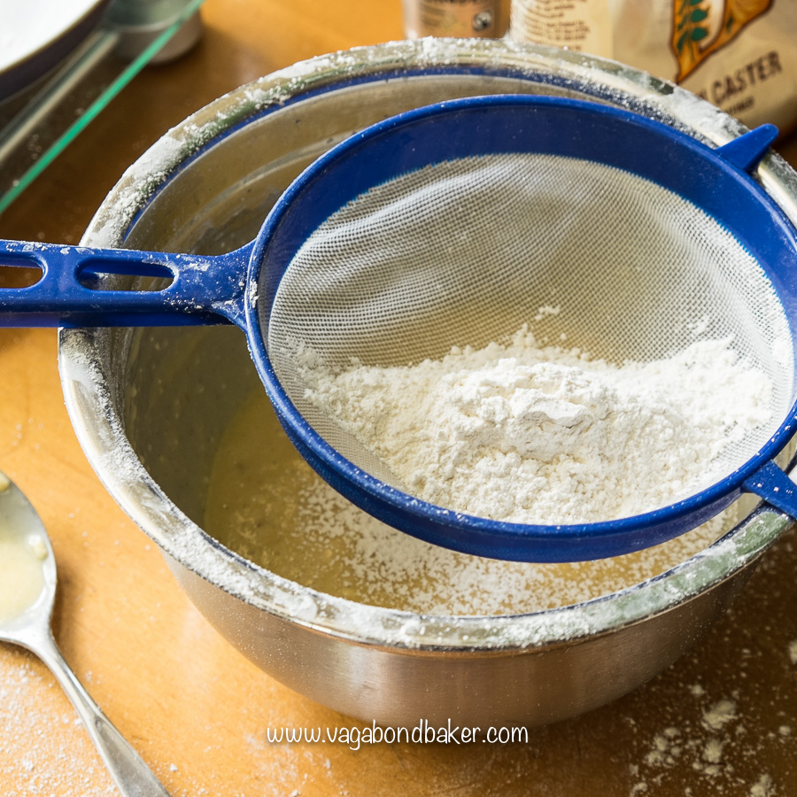 - Add the milk to the butter then whisk into the sugar/egg mixture. Combine the baking powder thoroughly with the flour in another bowl then sift half of it into the batter. Fold in with a metal spoon then sift the rest of the flour in and fold that in.