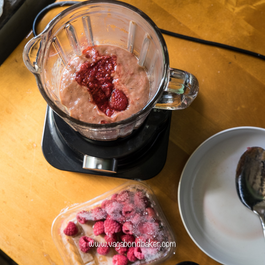 Once the rhubarb is cooked whizz it up in a blender or with a stick blender in a jug, you can add a few defrosted raspberries, like it did, to help with the colour, but it’s really not necessary. Set aside for a minute.