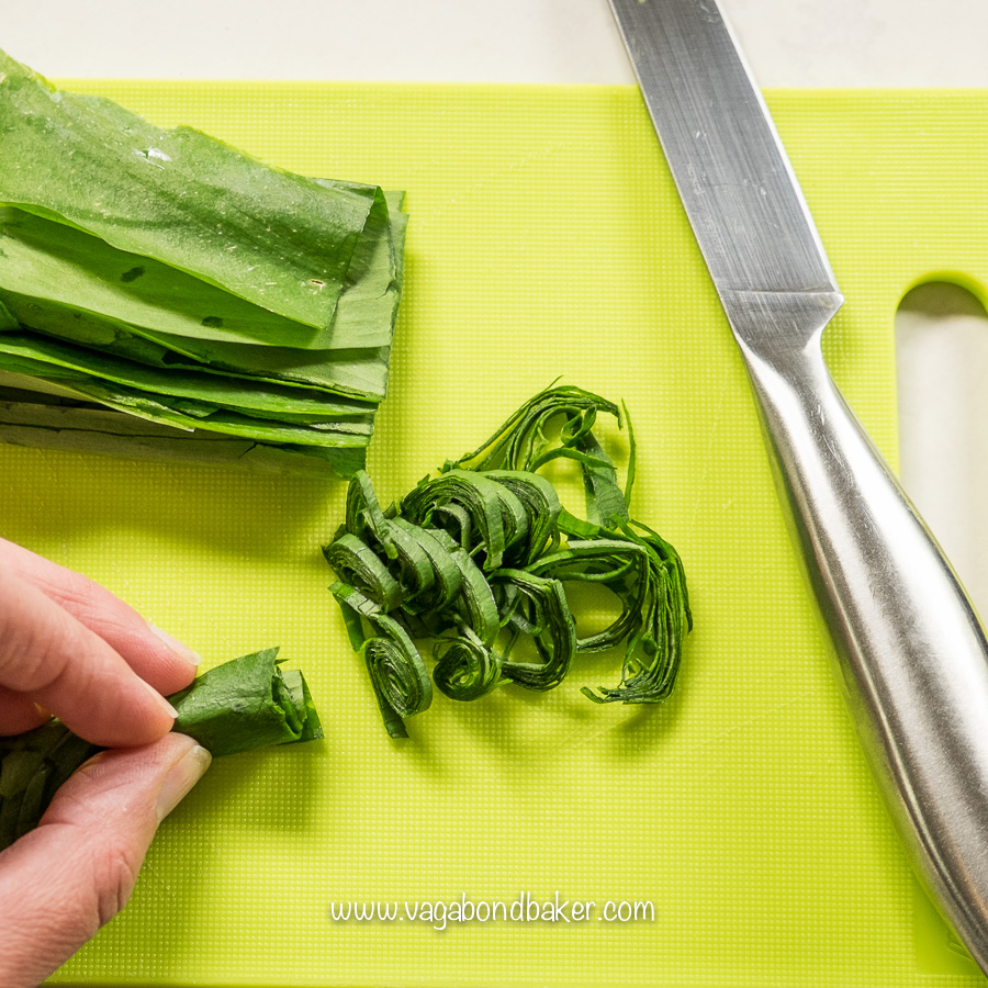 - Give the wild garlic a through wash. Strip out the thick leaf stem then stack the leaves and roll them up like a cigar before finely shredding them with a sharp knife. Set aside while you prepare the dough.