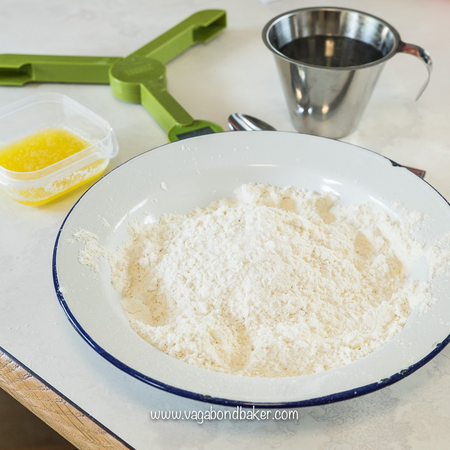 - Combine the salt and the flour in a mixing bowl and add half the melted butter.