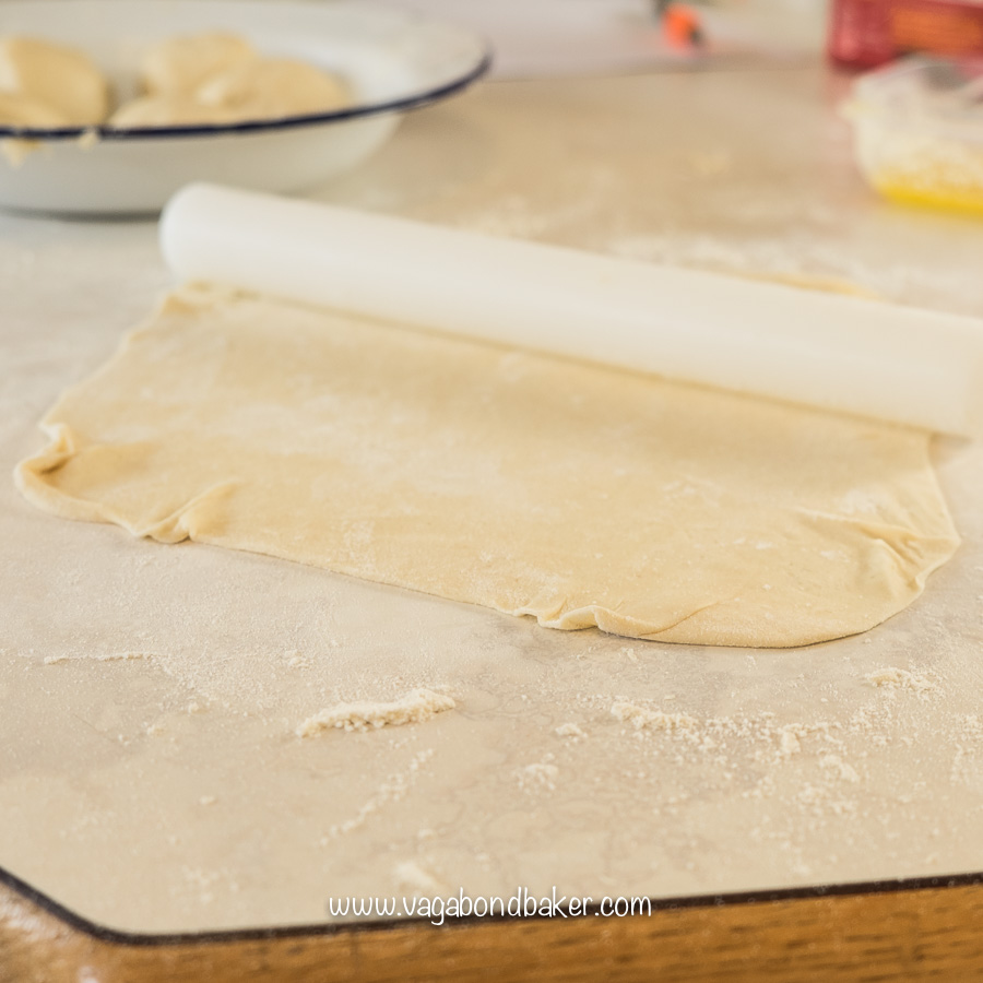 - Take one dough pinwheel and roll out, again dusting the work surface with flour, to a disk about 5 mm in thickness.