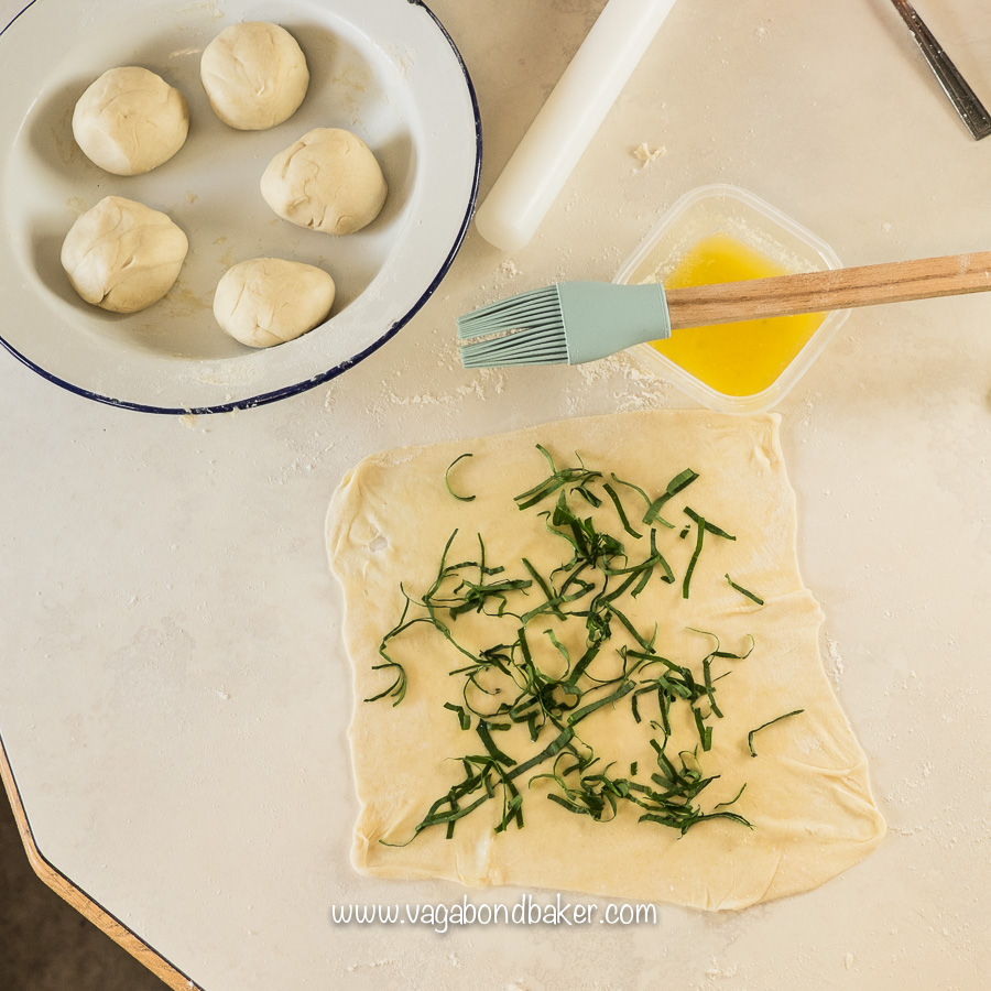 - Lightly brush a little of the remaining melted butter over it and sprinkle on a sixth of the shredded wild garlic.