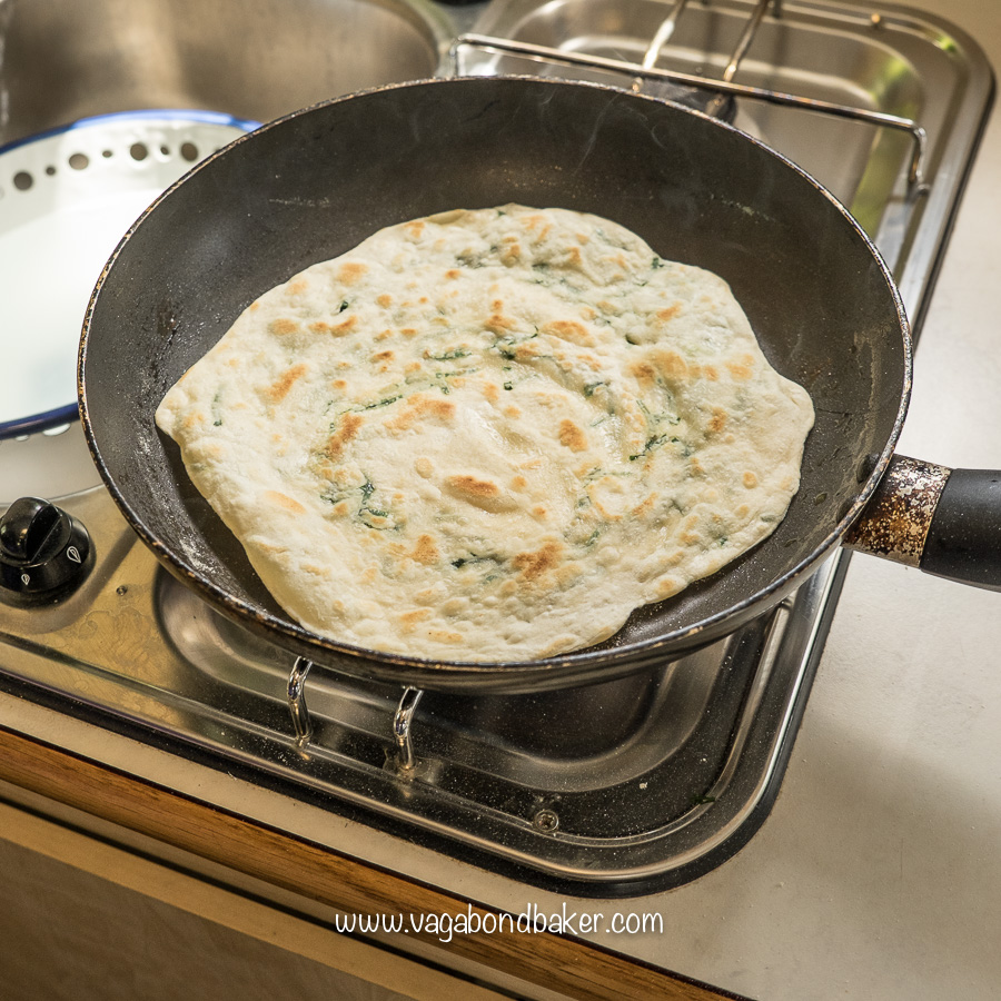 - Heat your frying pan over a medium to high heat. Place the flatbread oil-side down into the pan and fry for a minute or two until air bubbles begin appear on the surface and it takes on a golden colour on the underside.