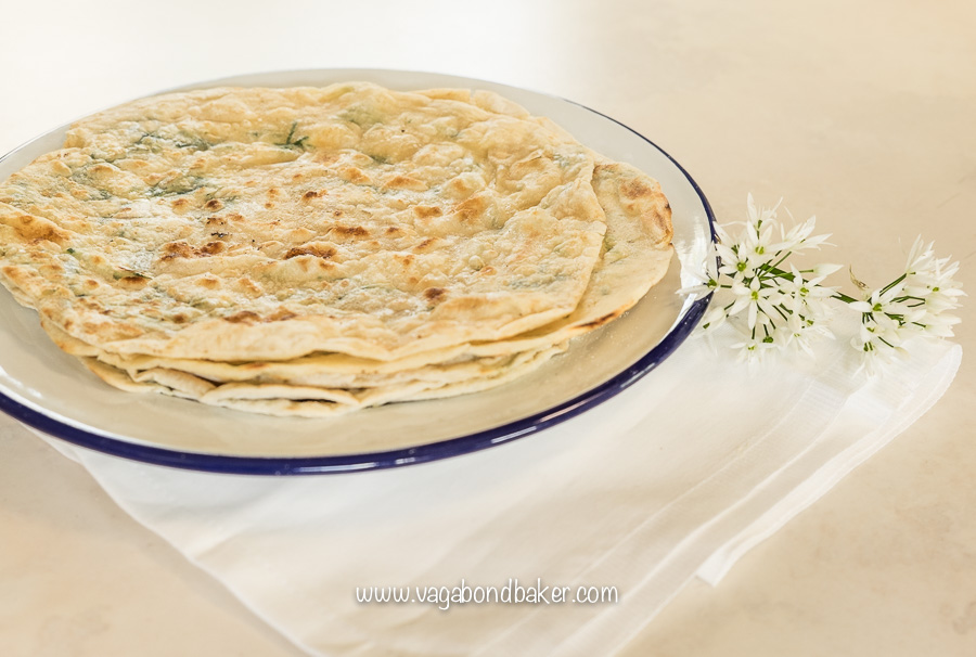 I’ve laced these flatbreads with wild garlic – freshly picked for free from wild–, it gives them a wonderful savouriness. If you can’t get hold of wild garlic then chopped chives would be a perfect replacement.
