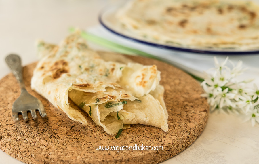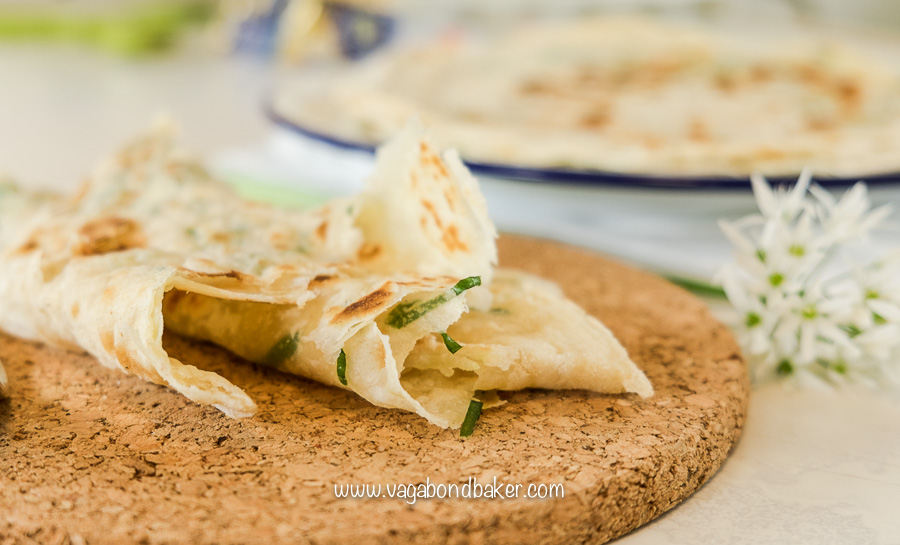 These flatbreads are super flaky, the dough is rolled out thin then a little butter is brushed over it and sprinkled with shredded wild garlic. Then it’s rolled up like a cigar and coiled up, this creates the wonderful layers that will give you the flakiness. A second roll out turns it into a flatbread, fry it then serve it!