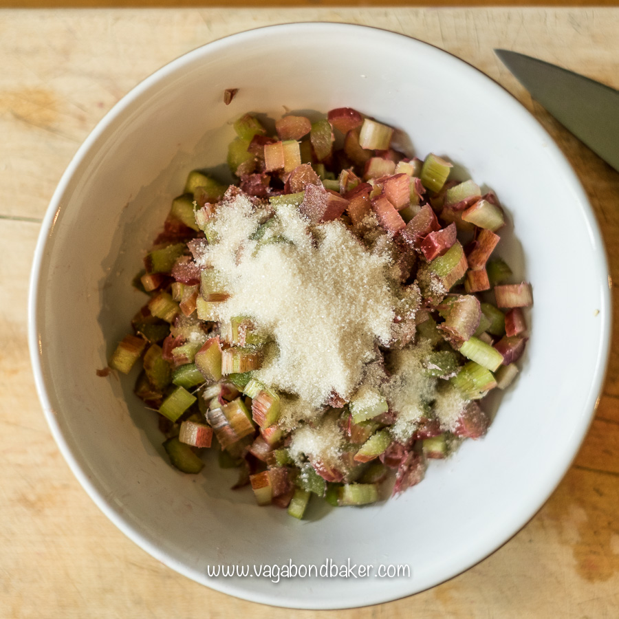 - With the rhubarb finely chopped, stir together with the 2 tablespoons of caster sugar and set aside.