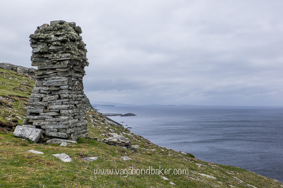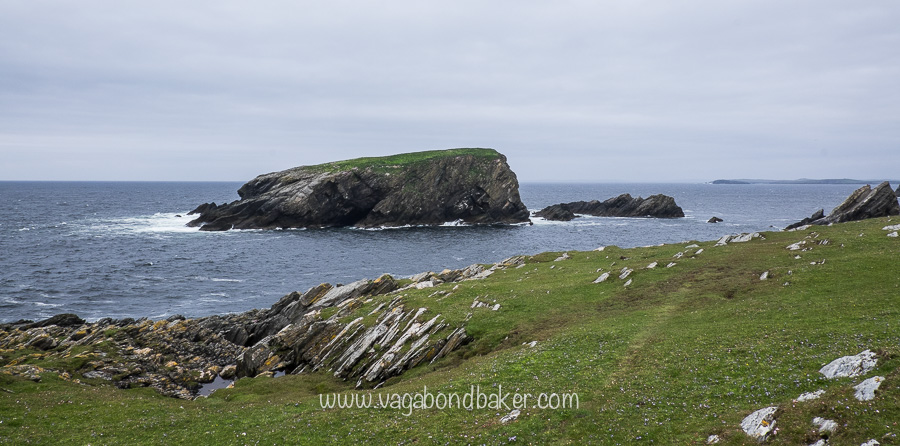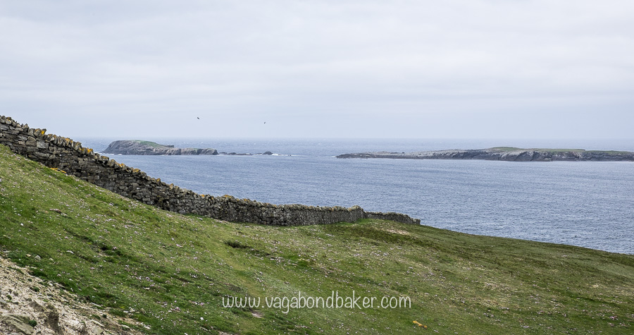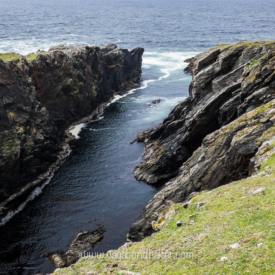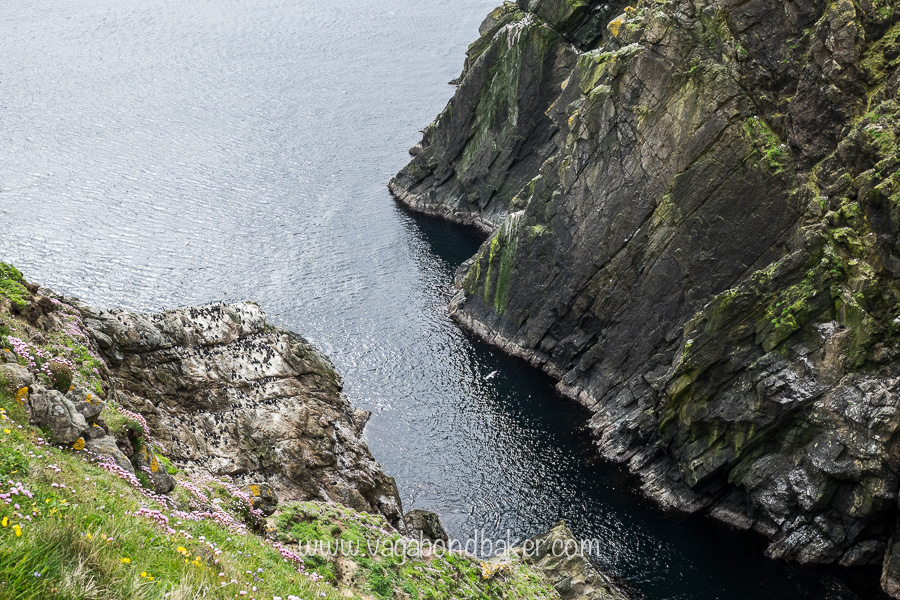 The grassy edge was clipped short by wooly sheep and tiny blue flowers mingled with the pink thrift, every now and again the land would suddenly fall away, a deep gorge cutting into the island down to the frothing sea below.