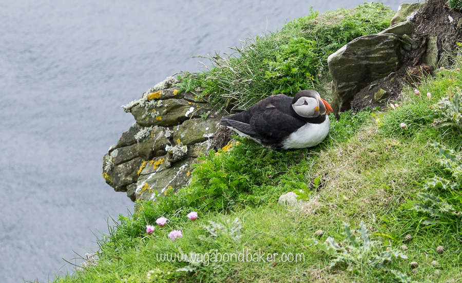 We wandered the cliffs; pretty fulmar sat nesting among the pink thrift and the comical puffins battled the wind to find their nest burrows at the top of the rock face. Lower down hundreds of guillemots seemed to defy gravity nesting on sheer rock bleached white with their guano.