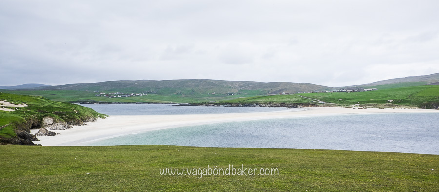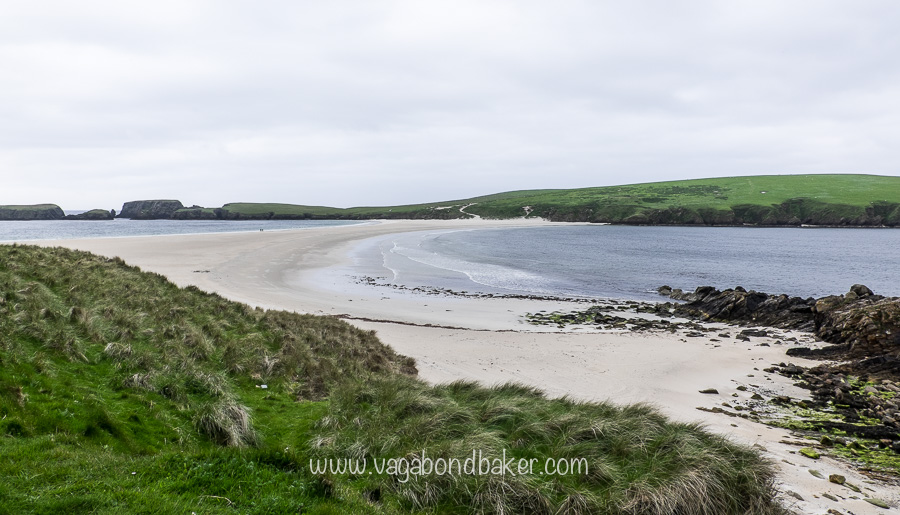 On the recommendation of Chris’s mum’s neighbours we headed to St Ninian’s Isle on the west of the southern mainland. A narrow strip of tarmac wound off from the main road then ran bolt straight through patchwork farmland to the tiny community of Bigton.