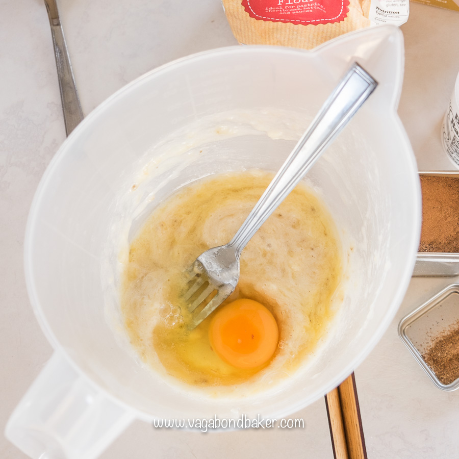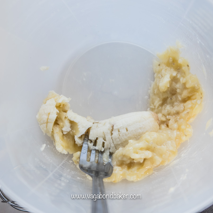 - Mash the banana with a fork to a gloopy mush, add the egg and beat well.