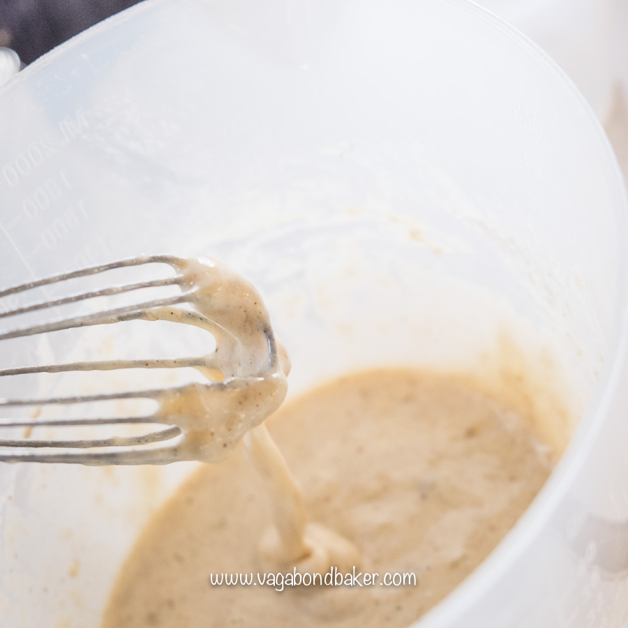 - Mix in enough milk to make a thick pourable batter.