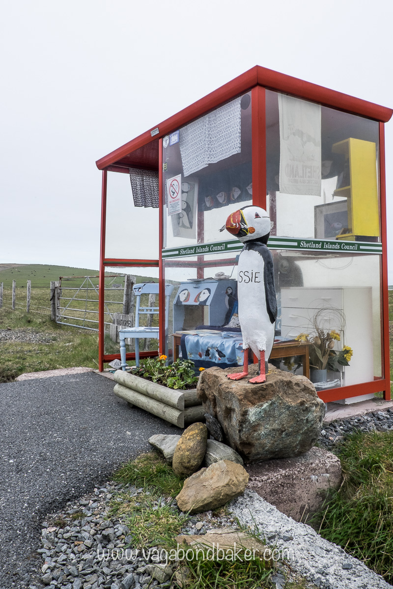 Just at the junction for the Keen of Hamar and the main road is the Unst Bus Shelter. This themed, decorated bus stop is possibly the most famous bus shelter in the world (I’d first seen it on Pinterest).