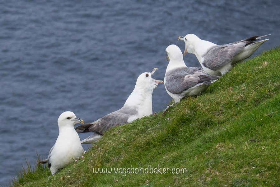 Despite the smell, the spectacle is extraordinary. Thousands of these big white birds noisy perch on the vertical cliff face, their nests spaced just out of the pointy bill reach of their neighbour. It is mesmerizing to watch the interaction between the birds and Hermaness is a great place to experience this as the birds are nesting on land rather than on an off-shore sea stack or rock.