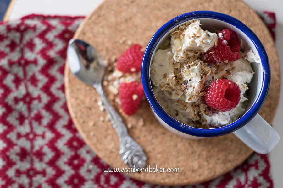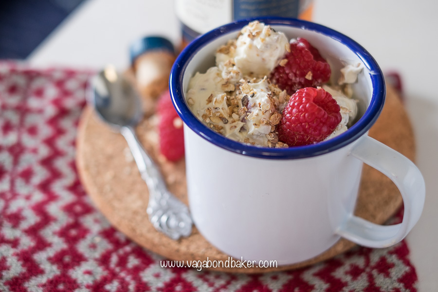 I raided the fridge and I fortuitously had a tub of double cream and a small punnet of raspberries – the beginnings of a great dessert right there! I always have oats and Mr VB usually carries a bottle of whiskey, it didn’t take long to decide on Cranachan!